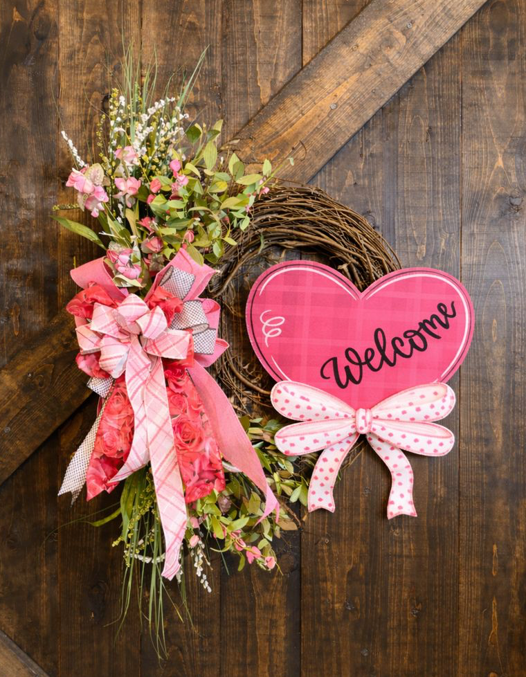 A beautiful pink “Welcome” wood heart sign, fully customizable
