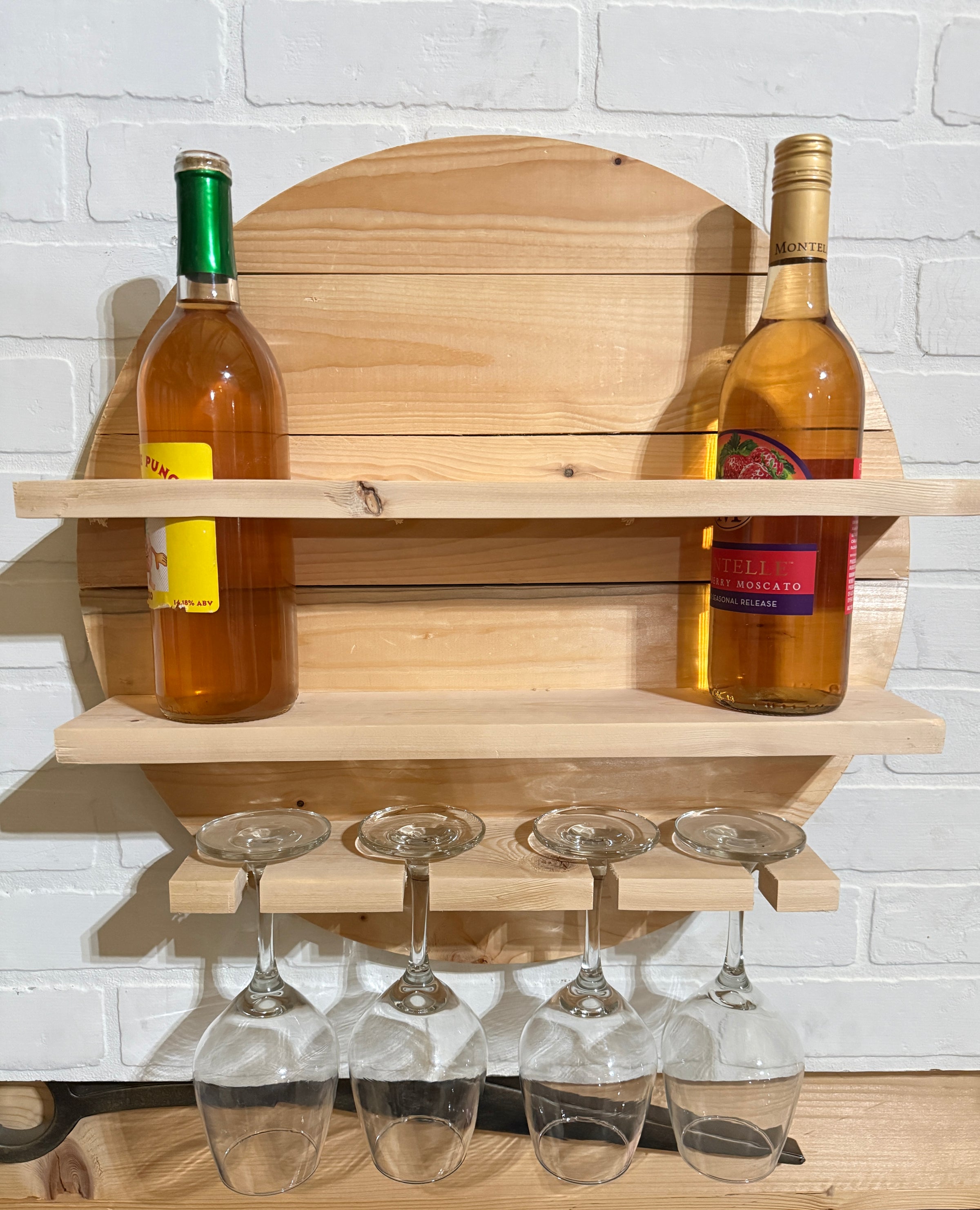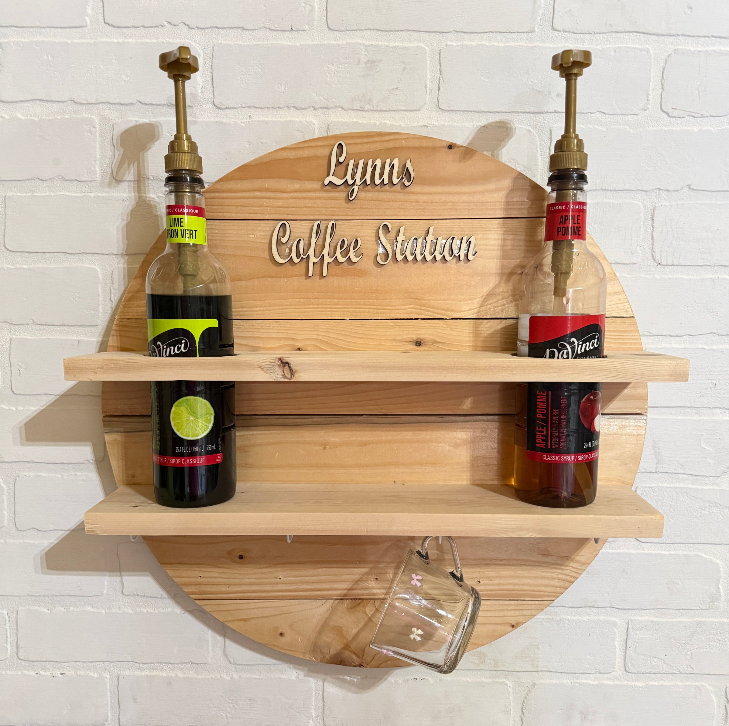 Elevate your home bar, kitchen, or dining space with this beautifully crafted wooden wall-mounted wine or coffee rack bar. Designed with both style and function in mind, this piece holds two standard wine bottles or two coffee syrup bottles and includes a built-in rack to hang four stemmed wine glasses or 4 coffee mugs—making it perfect for entertaining or everyday use.